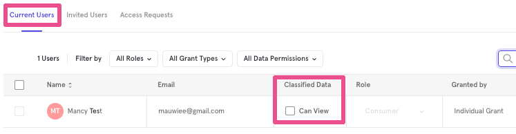 In the CURRENT USERS table, the Classified Data column indicates which users have permission to view classified data. Click the Can View check box in a user’s row to update their classified data viewing permission.