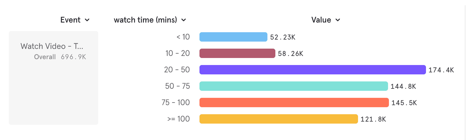 • Compare # users based on duration of video watched: < 30, 30-60, 60-90 mins
