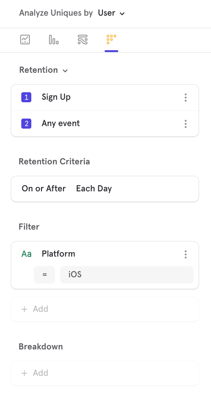 In this case, since we want to know retention after signup, choose "Sign Up" in the first event slot. Then, we want to know if users are coming back and using the product, so choose "Any Event" in the second event slot. At this point, your query should look like this: